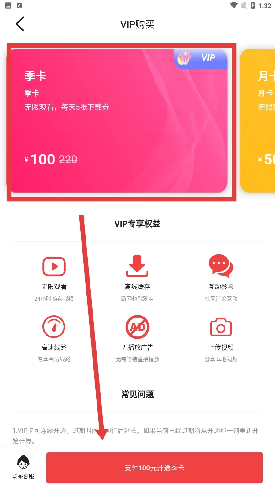 3、进入VIP购买页面后,找到并选择【季卡】选项,接着点击页面底部的【支付100元开通季卡】按钮,完成支付流程以开通季卡VIP,之后就能畅享VIP专属权益了。