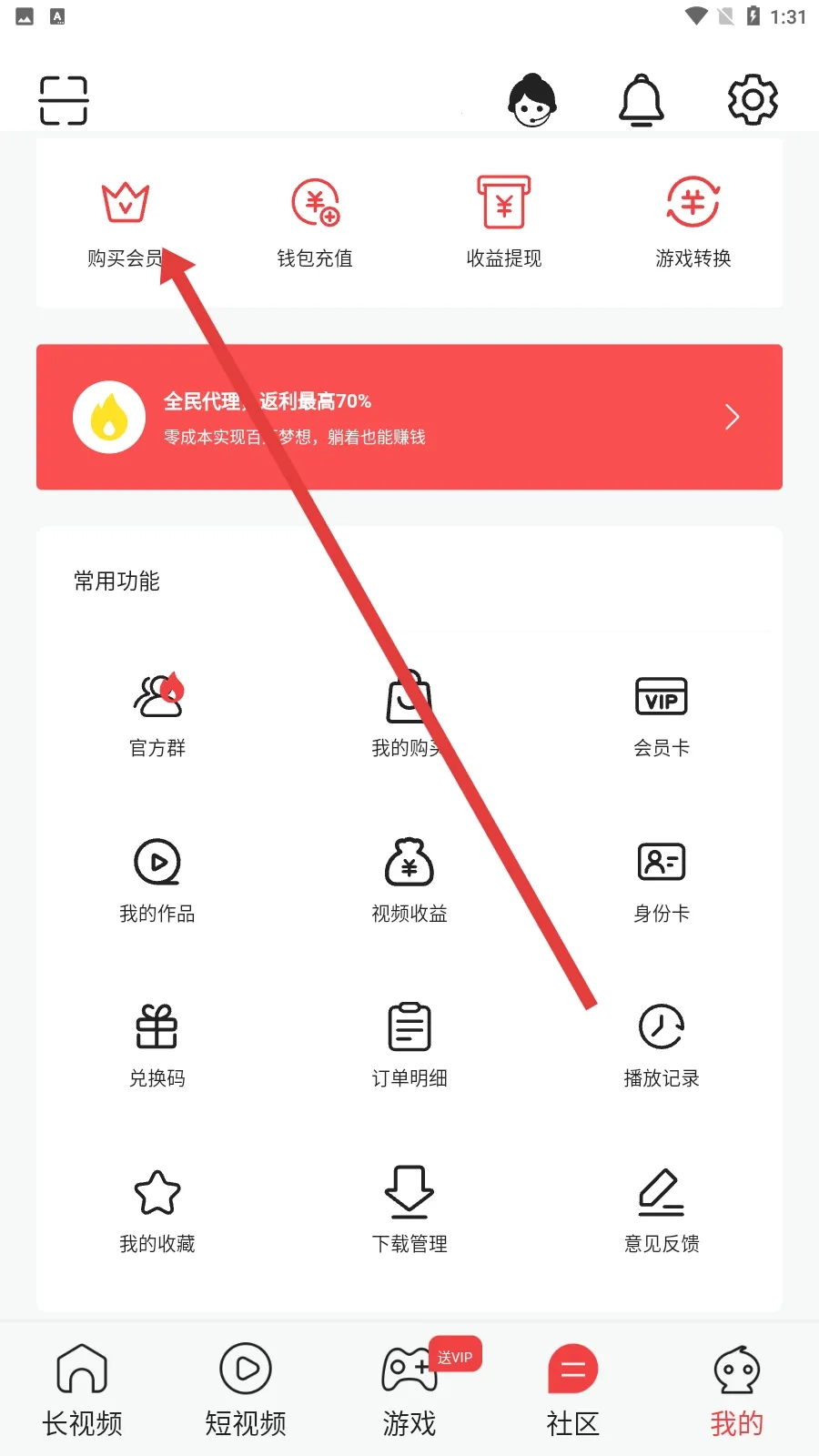 2、进入个人页面后,找到并点击【购买会员】选项,即可进入VIP购买界面。