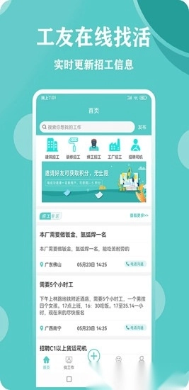 这是一个建筑工地招工找活的平台,在这里你能快速在线查看各类最全的工作信息,了解平台内不同的工种服务。建筑工友可以选择对应工种发布信息,平台会帮你快速找到合适的工友,并且会优先展示附近的工地招工信息。