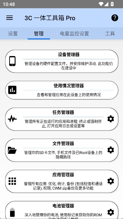 电池管理器可协助识别并优化耗电应用,从而延长电池使用时长;网络管理器能够设置WiFi接入点的优先级,还可以对Android防火墙等进行配置。