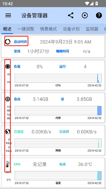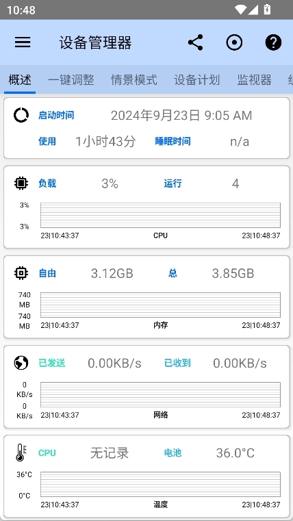 2、点击“设备管理器”,在该界面中能够查看手机的使用时长、负载情况、CPU状态等多项数据的实时监测信息