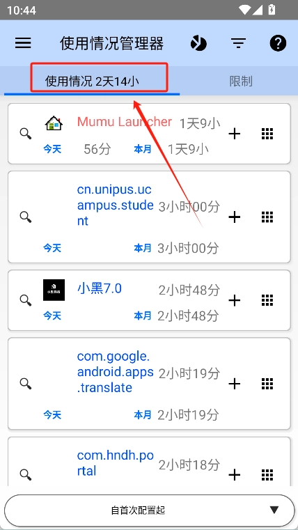 3、在首页找到“使用情况管理器”,点击进入后可以查看手机的使用情况,并且能够对某一款手机软件设置使用限制。