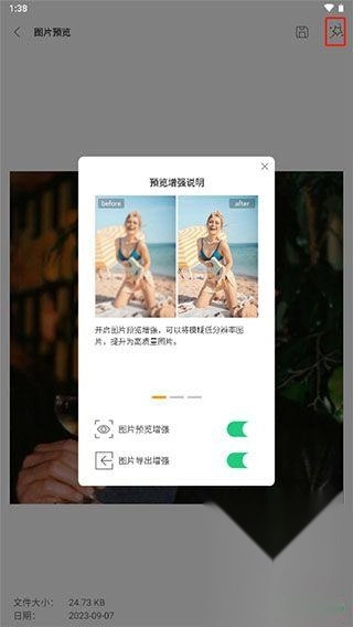 4、要是图片质量不太好,你可以点击右上角的星星图标,然后选择开启导出增强功能。