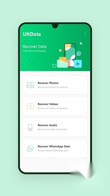 3、直观主界面:该软件操作简便,用户只需在手机上安装并启动UltData,即可看到直观的主界面。主界面设计简洁清晰,图片、视频等各类恢复选项都清晰可见。