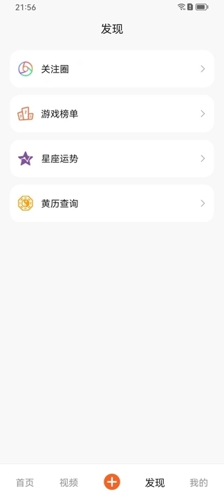 4、点击发现按钮,就能查看关注圈动态、游戏榜单、星座运势以及黄历查询等内容。