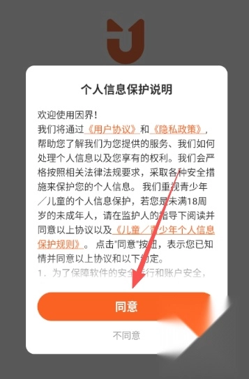 1、打开因界点击同意