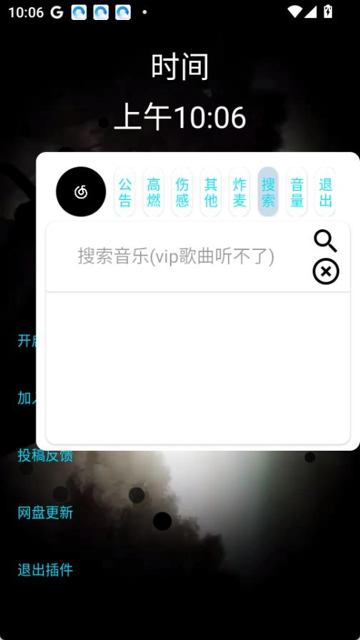 这款音乐插件属于聚合类音乐软件,界面设计简洁大方,无需登录即可直接使用。它了多线路音源搜索功能,同时支持悬浮窗、用户投稿以及网盘更新等实用特性。该插件主要针对两类用户群体:一是喜欢免费听歌的用户,二是热衷于DJ/Phonk高燃串烧的爱好者。用户点击搜索按钮就能进行音乐检索,此外平台还按照高燃、伤感、炸麦等不同风格对歌曲做了分类整理。
