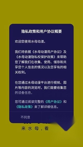 1、下载安装水母动漫应用,打开进入后,需先同意隐私政策与用户协议;