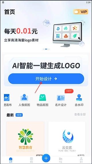 1、打开一键logo设计应用,点击“开始设计”按钮,即可进入一键logo设计的操作流程。