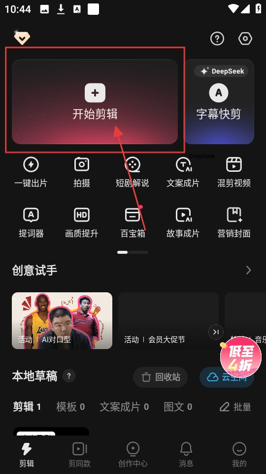 1、在首页点击【开始剪辑】按钮,就能进入视频剪辑页面啦。