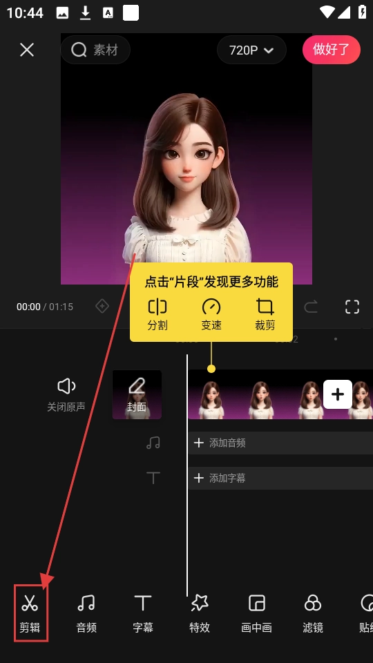 3、导入视频后,点击左下角【剪辑】按钮,可使用分割、变速、裁剪等功能哦。