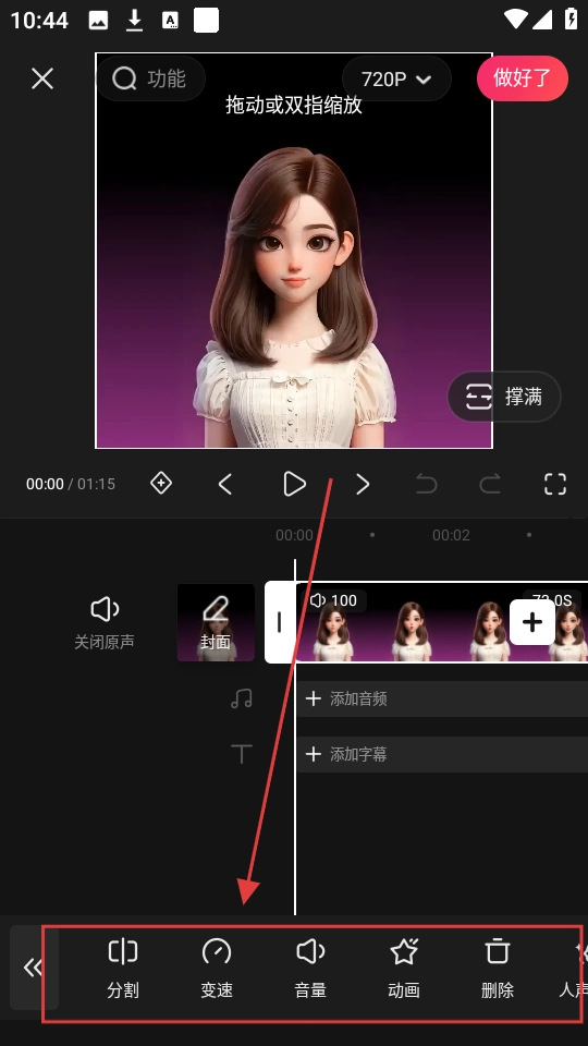 4、点击剪辑后,会弹出分割、变速、音量等功能选项,可根据需求进行视频编辑哦。