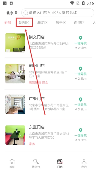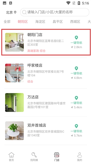 3、在经过筛选的列表里,找到【朝阳门店】,它显示的类型是【高端家政-综合】,另外还能查看这家门店的距离等相关信息。