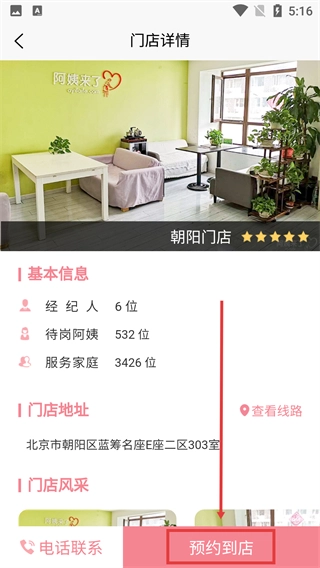 4、进入【朝阳门店】的详情页面,查看【基本信息】板块下的【门店地址】等相关内容后,点击页面底部的【预约到店】按钮,就能发起本次到店预约申请。