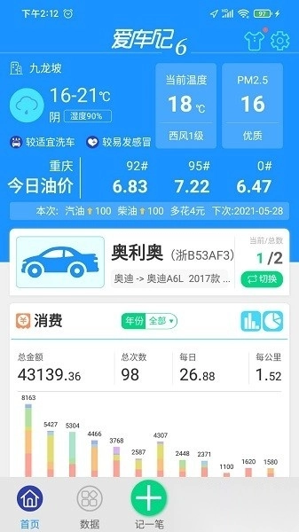 爱车记油耗版为车主提供全面的汽车管理服务,用户可通过它实时掌握车辆各项数据与使用状态,还能查询当日天气、最新油价及道路通行状况,软件内一键即可查看历史服务记录,让日常用车更省心高效。