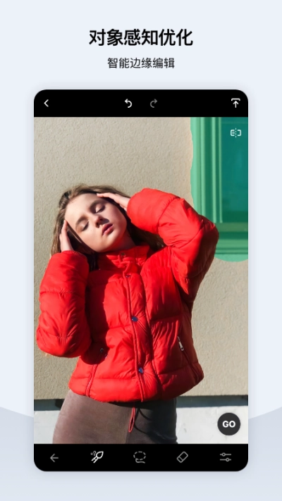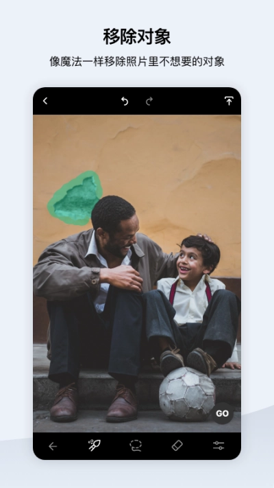 用画笔涂抹完成后,选择第三个橡皮工具,对水印周围画笔覆盖的区域进行修饰,修饰好后点击界面上出现的“GO”按钮。