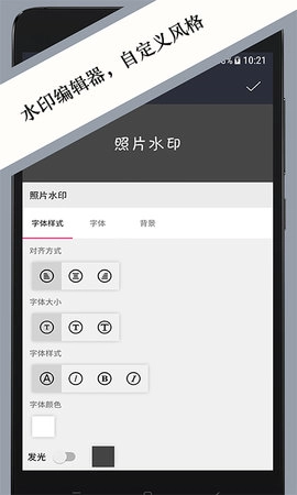 照片水印是一款功能强大且操作简便的图片美化工具。它不仅拥有丰富多样的文字与贴纸可供选择,还能灵活调整水印的位置和样式。借助这款应用,你可以轻松为照片添加个性化水印,让照片更具趣味性和独特性。无论你是想保护照片版权,还是展示个人创意,照片水印都能助你达成目标。快来使用照片水印,为你的照片增添一份别样的魅力吧!