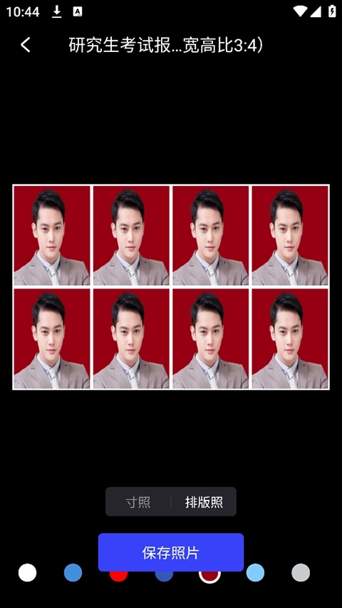 5、接着,在成功导入或拍摄照片后,就能在弹出的照片处理界面里,点击底部照片底色选项板中的任意颜色,来更换照片的底色。