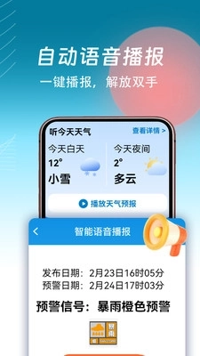 精准天气通具备强大的天气查询功能,依托精准的广播系统。用户可在线查询各地城市的天气情况,还能享受恶劣天气提醒服务,外出时能直观了解天气信息。天气变化时,该应用会助您做好出行准备,它可自动定位您当前的位置,让您清晰查看天气数据,包括每日气温、紫外线强度、空气质量等,各项信息一目了然。