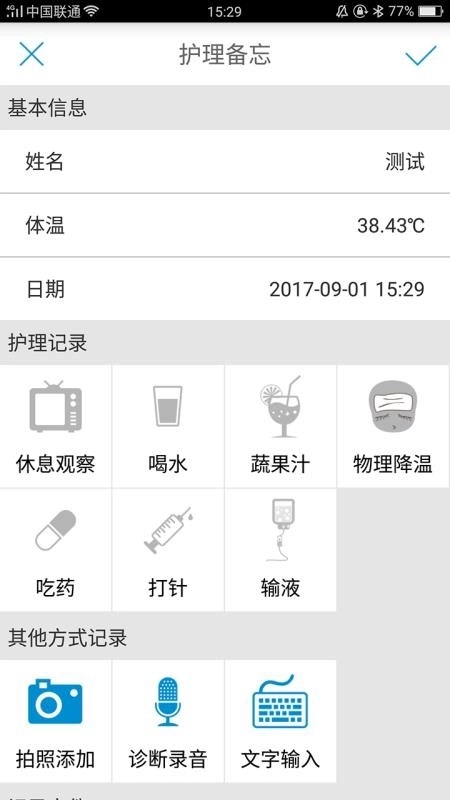 可以随时随地方便地查看个人的护理记录,像喝水、服药、打针等情况都能详细记录下来。