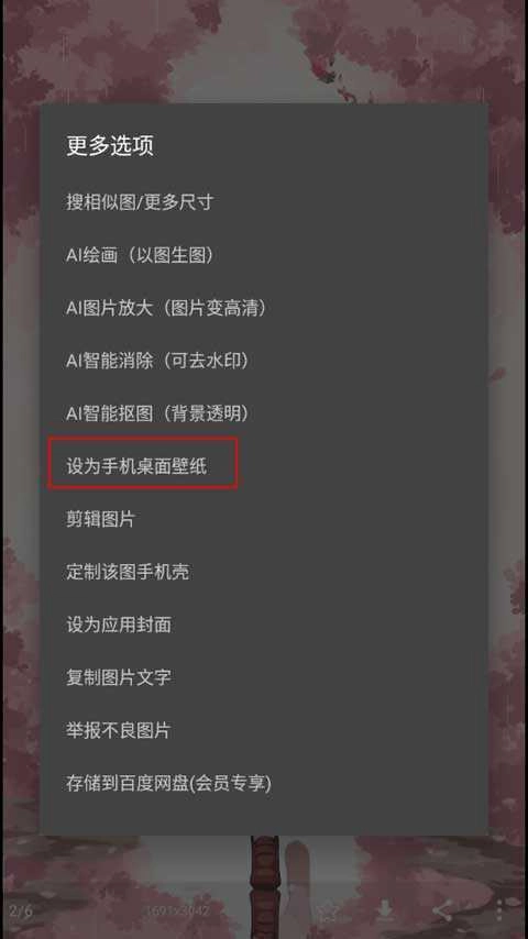 3、完成后点击右下角的三点图标,选择“设为手机桌面壁纸”。另外,也能在我的相册里把壁纸设置成动态锁屏壁纸。