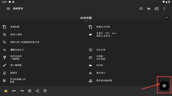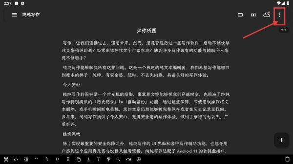 打开纯纯写作应用,点击右上角的三点菜单按钮,展开功能菜单。