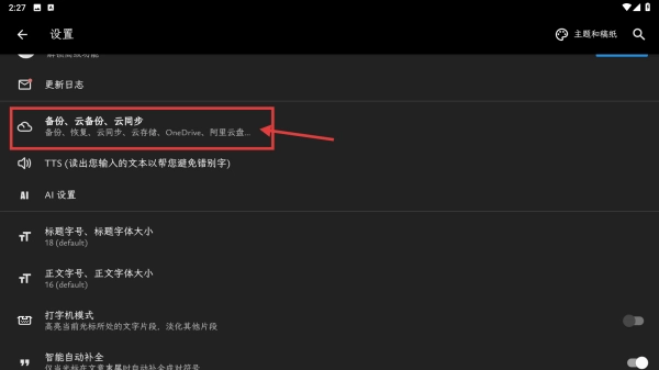进入设置页面后,依次点击备份、云备份、云同步选项,即可进入备份同步设置页面。