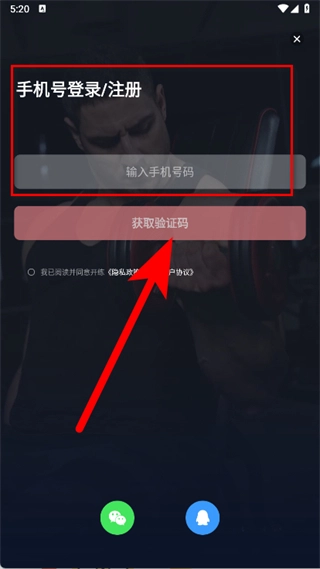 在手机号登录注册页面,输入手机号,勾选相关选项后,点击“获取验证码”按钮。