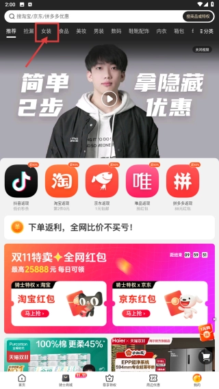 在折扣页面,点击女装分类标签,筛选女装类商品。