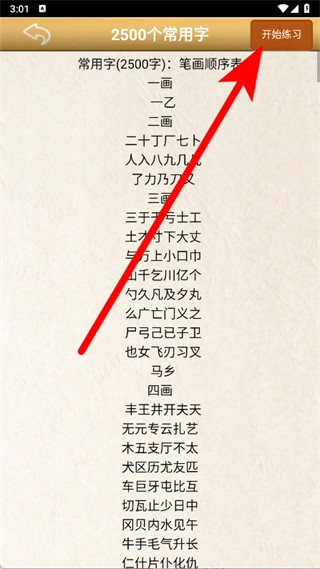 进入字帖内容页面后,点击“开始练习”按钮,即可进入练字环节。