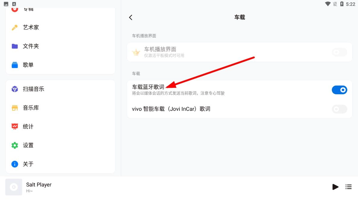 在车载设置界面,你可以对车载蓝牙歌词之类的选项进行相关设置。