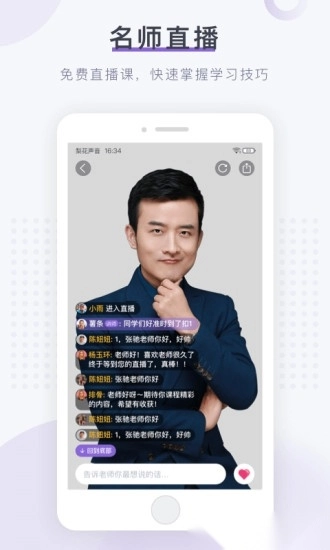 公开直播课,行业明星大咖直播分享行业知识,发送弹幕,与大咖实时互动。