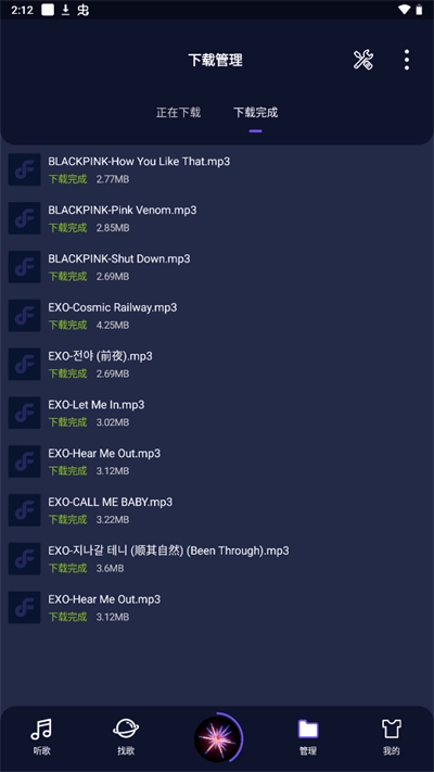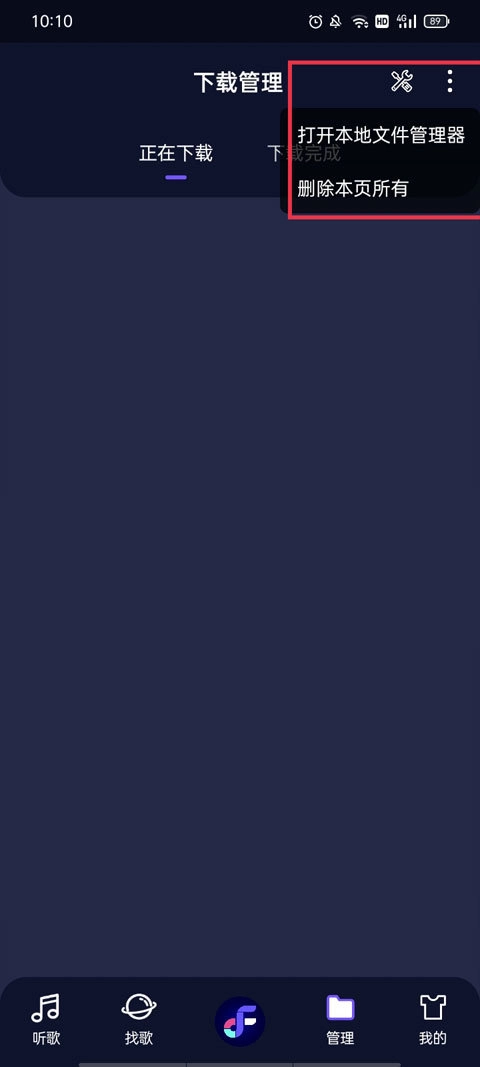 4、【管理】界面显示的都是已经到本地的音乐,如果想要删除音乐,可以全部选中有选择的删除音频。