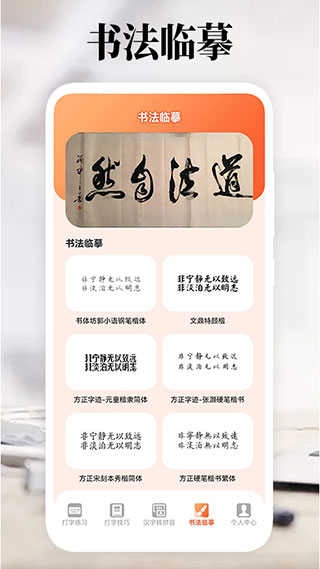 5、还有“书法临摹”功能,包含书体坊郭小语钢笔楷体、文鼎特颜楷、方正字迹-元童楷隶简体以及方正字迹-张灏硬笔楷书等多种书法,全部免费提供练习。