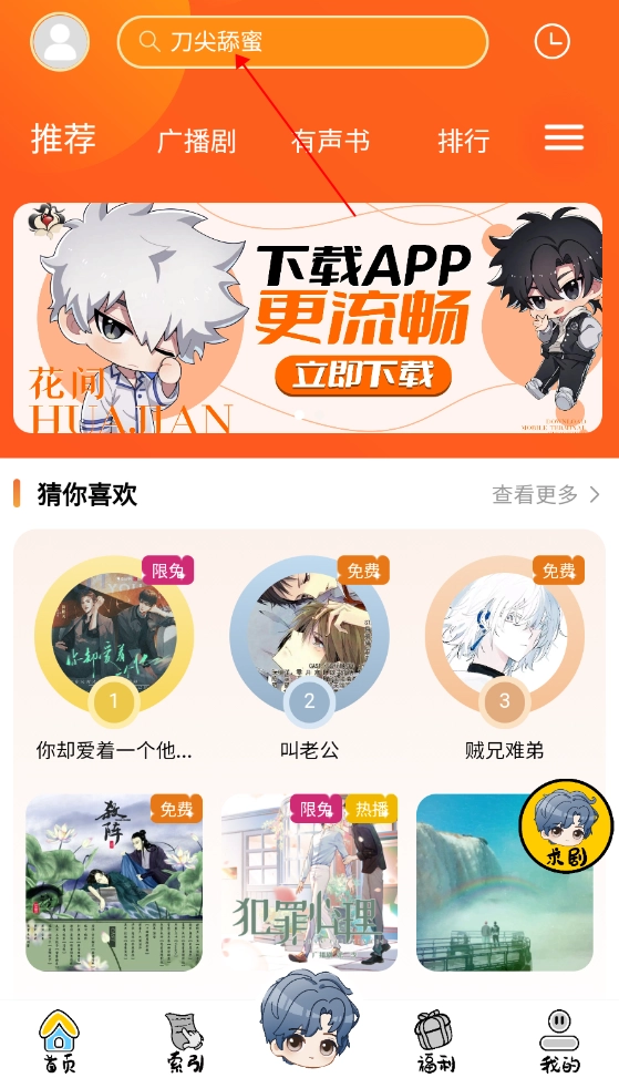 2、点击如下图所示的框架,即可对想听的任意广播剧进行精准搜索。