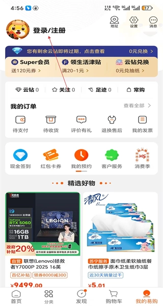 1、启动苏宁易购应用,进入首页后,能看到各类商品的分类展示以及新人专享优惠活动,接着点击“我的易购”选项,即可进入个人中心页面。