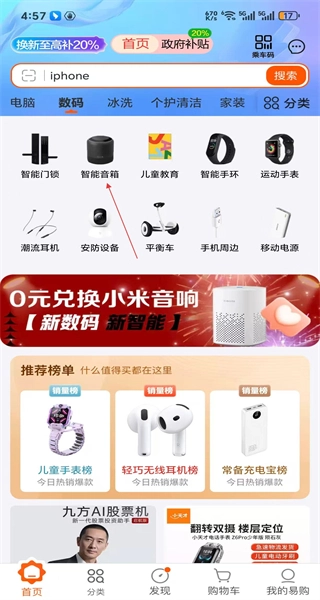 4、登录成功后返回首页,搜索与iphone相关的商品,同时浏览数码分类下的智能设备,比如智能音箱。