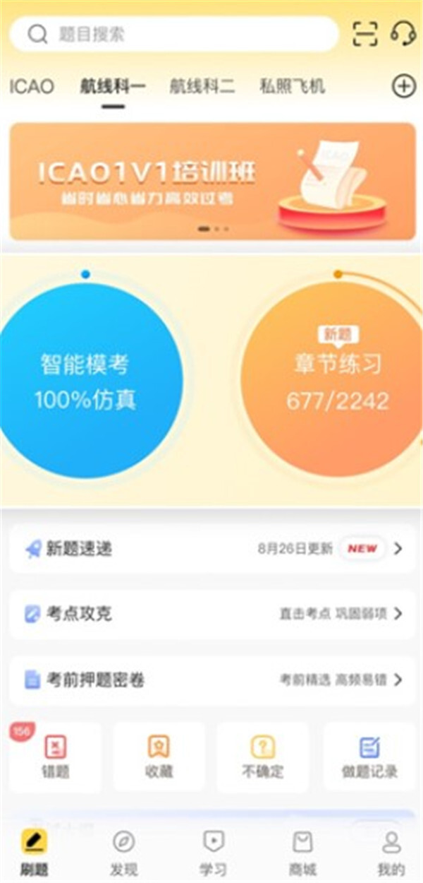 2. 用户能够在软件上选择诸如航线科一、航线科二以及私照飞机等学习内容。