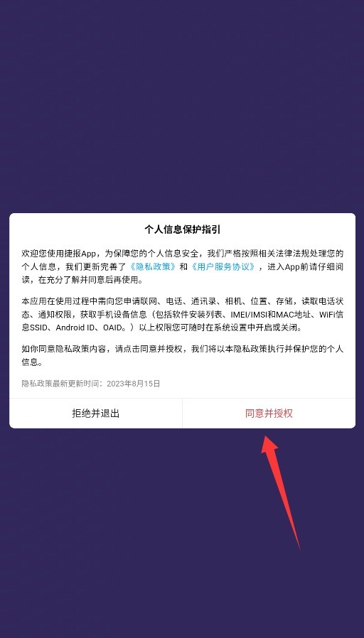 1. 当首次启动捷报比分时,系统会呈现用户服务协议以及隐私政策,您需仔细阅读,随后点击“同意并授权”方可进入应用。