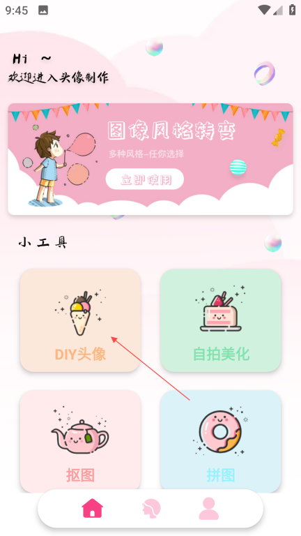 3、来到首页,点击【DIY头像】图标,导入头像图片。