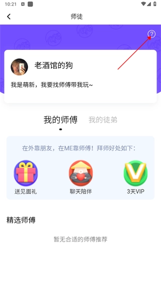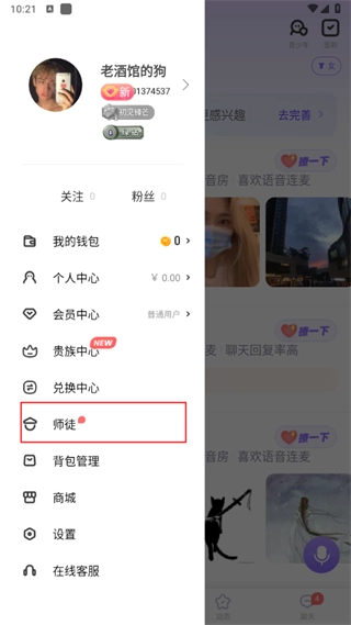 打开软件,点击左上角头像找到“师徒”选项。