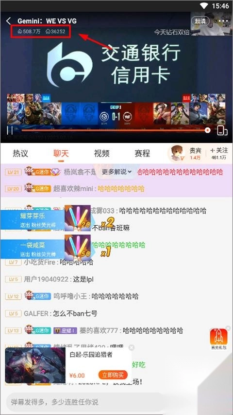 4、暂停之后,视频的左下角就会出现一个人气值,如果时间没有弹幕或者是礼物,那就是人数,反之则要减去一些才会是当前房间的人数。