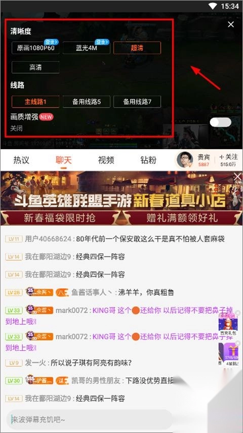 4、其次还有线路的选项,通过线路的选择,找到观看人数更少的线路,能让直播的播放更加流畅,避免出现卡顿。
