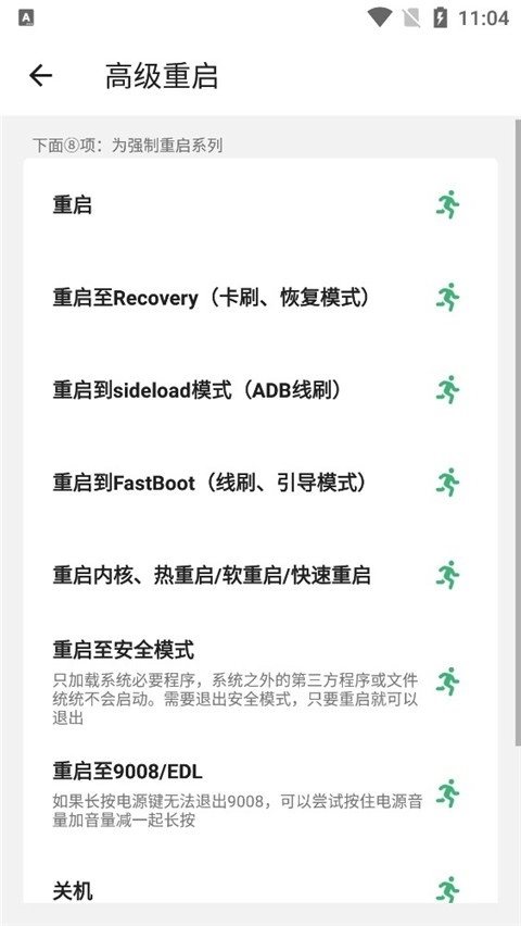 4、接着进行高级重启操作,在此步骤中可以选择设备重启后进入的界面,例如重启后进入卡刷模式或者fastBoot模式。
