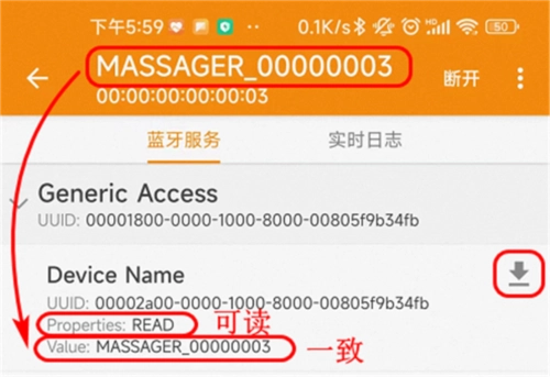4、比如服务GenericAccess里面有个特性是DeviceName设备名,属性Properties为Read可读,界面有个向下的箭头代表download,点击就能读出Value,和最上面的蓝牙名称是一致的;