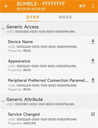2、到BUMBLE这个设备,点击连接,连上之后,就会看到4个蓝牙服务,实时日志里也会看到连接状态的提示;