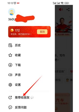 1. 先安装360纳米ai搜索并完成注册,注册后会自动弹出签到界面和获取纳米的相关方法;也可以点击左上角的头像进入个人中心,再点击“推荐给朋友”选项。