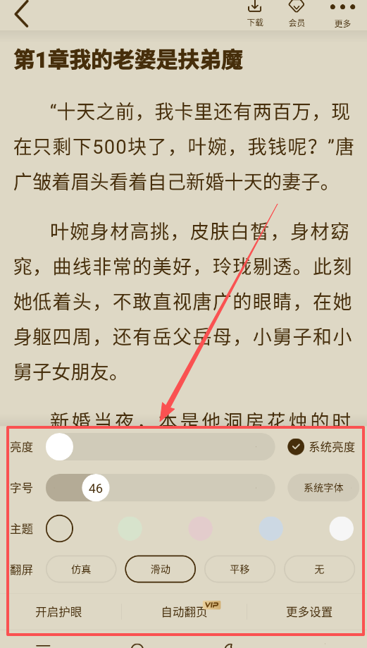 3、阅读过程中要是感觉字体偏小或者屏幕过亮,可马上打开调节面板,这里提供了从系统字体到主题风格的全方位设置选项,只需滑动切换就能即时查看效果变化。