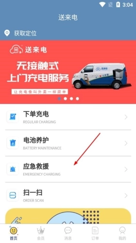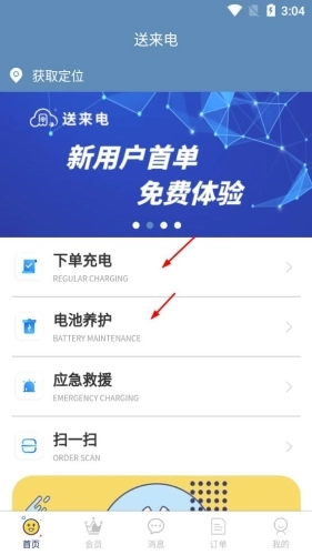 2.点击首页的功能选项,基本涵盖了用户日常所需的功能,其中包括在线下单为电车充电,还能预约专业充电人员提供一对一上门养护服务,以此保护电池寿命、延长电池使用时长。