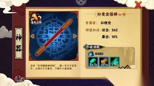 每位英雄皆拥有专属神器,除增加攻击外,还附加诸如暴击、幸运、回血、闪避等其他属性。神器等级提升,所需材料品质与消耗的灵魂亦随之升高。不过,神器在同等级时,所需升级材料一致。并且,神器战斗力加成与法宝加成的战斗力不相上下,努力刷取材料升级神器以提升战斗力,肯定是明智之举。